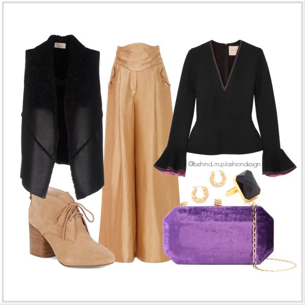Neste look para o tipo de corpo Triângulo Invertido trouxe uma combinação para ampliar a parte de baixo através de cores mais claras e tecidos nobres. Proponho para tempo frio, top blusa escura peplum decote V, para moderar a parte de cima, com punho godê para aumentar os quadris ao estar com as mãos abaixadas. Por cima um colete preto bem quentinho por dentro (lã de carneiro) e de couro por fora para dar um aspecto moderno. A calça pantalona de seda, shantung ou outros tecidos, é de cor clara para aumentar essa região (ilusão de ótica - trazendo uma forma "A"), se for de baixa estatura deve cobrir a bota de salto alto da mesma cor da calça, para alongar a silhueta e as pernas (sugeri na imagem uma bota de camurça/suede). Aproveitando o look neutro, acrescentei um toque vibrante de cor utra violet na bolsa de veludo à tira-colo. E por fim arrematei a proposta com um anel poderoso para chamar a atenção para as mãos. Gostou? Comente se usaria 🤗😘